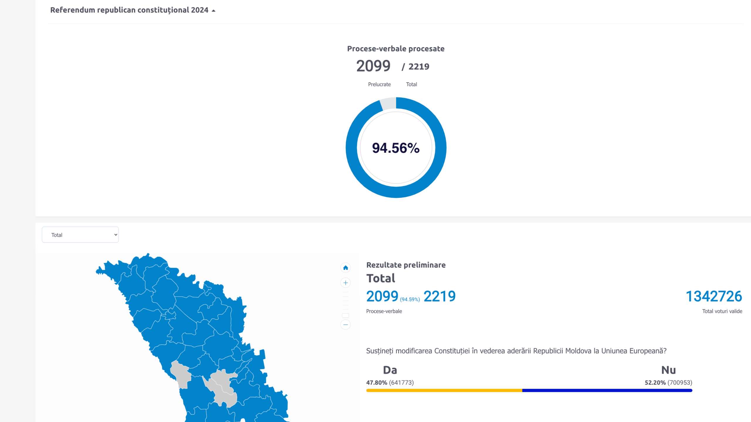 După ce CEC a afișat rezultatele preliminare din aproape 2100 de secții de votare din totalul celor 2221 de secții de votare deschise pe teritoriul Moldovei și în diasporă, există o mare probabilitate ca referendumul pentru aderarea la Uniunea Europeană și modificarea Constituției inițiat de Maia Sandu să nu treacă de votul popular.