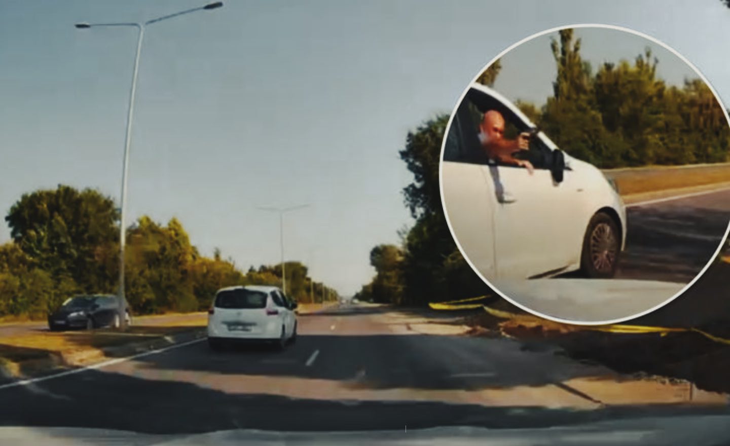 În imaginile video se vede că, de pe geamul automobilului alb de model Renault, un bărbat înarmat trage în direcția altei mașini.